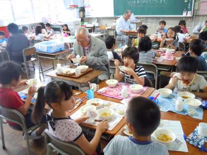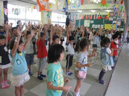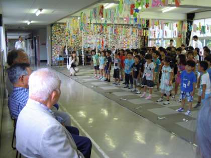 今日は、毎日お世話になっている見守り隊の方々を招待しての七夕会でした。歌やおどりの発表や、それぞれのクラスの願い事を発表をしました。七夕会の後は、いっしょに給食も食べていただきました。楽しくお話をしているうちに、あっという間に時間が過ぎていきました。