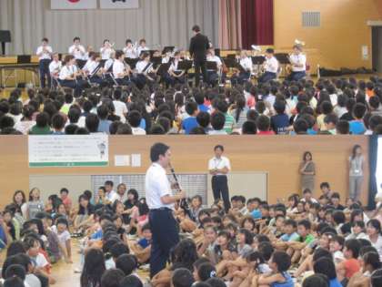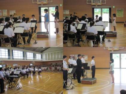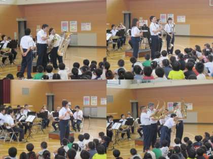 3・4時間目に消防音楽隊の演奏を聞きました。演奏会の中で楽器の紹介があり、楽器の種類と音色がよくわかりました。また、指揮者の体験コーナーがあり、1年生と4年生の2人の児童が選ばれ実際に指揮を体験しました。そして、消防音楽隊の演奏で「音楽のおくりもの」を全員で歌いました。最後に、すばらしい演奏をしていただいた音楽隊のみなさんに、代表児童がお礼を述べました。