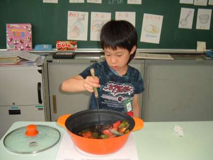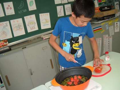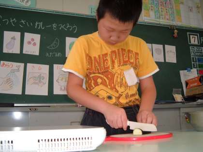 みんなで育てた野菜を使って、カレーを作りました。包丁でけがをしないよう丁寧に切りました。野菜がいっぱいのカレーになりました。