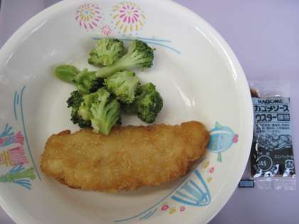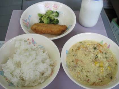 ごはん たまごとトマトのス−プ ささみチ−ズサンドフライ ブロッコリ−のドレッ シングあえ 牛乳