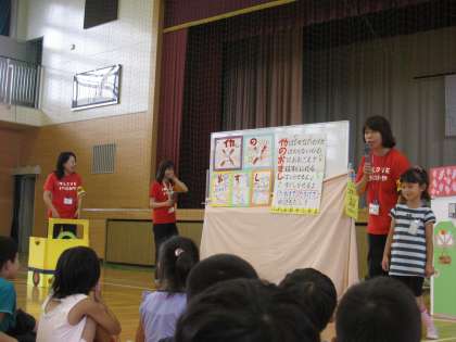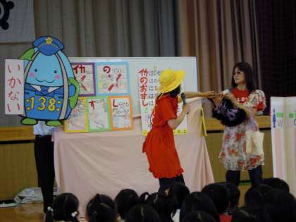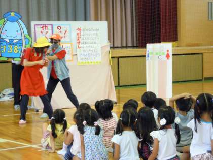 今日は防犯教室がありました。もうすぐ夏休みということもあり、気をつけなければいけないことをたくさん教えていただきました。子どもたちは一生懸命話を聞き、合言葉の『いかのおすし』を覚えました。