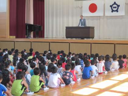今朝は、終業式を行いました。校長先生から「1学期を振り返って、校訓『正しく、力いっぱい伸び、共によくなろう』の特に『共によくなろう』と心がけましたか」と問いかけがありました。そして「お互いに助け合って共によくなること、そのためにいじめは絶対に許されないこと、自分のことよりまず人の気持ちを考えること」が話されました。最後に「夏休みには、夏休みにしかできないことを十分楽しみ、また、元気な顔を見せてください。」と話されました。