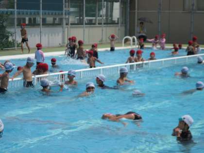 学校のプール開放には、たくさんの子が来て、元気に遊んでいます。