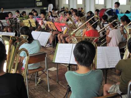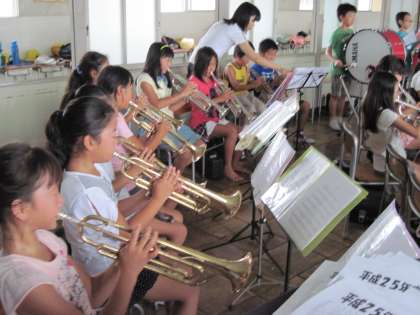 今日はあいにくの雨となり、サッカー部は中止となりましたが、金管の部活動は予定通り実施されました。9月に行われる運動会に向けて、猛特訓中です。どの子も真剣な表情で楽譜を見つめ、一生懸命に自分の担当の楽器を演奏していました。