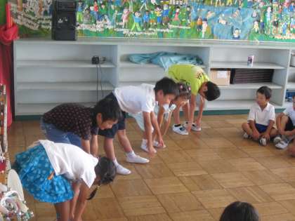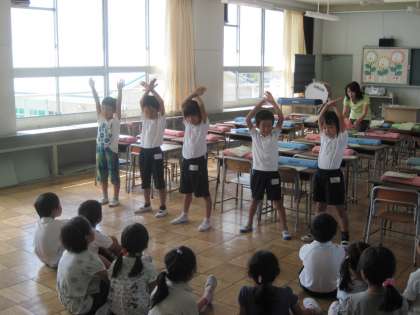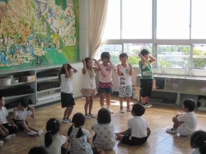 音楽の時間に「ドレミファソラシド」の音階を体で表現しました。グループに分かれて練習し、その後、グループごとに発表しました。