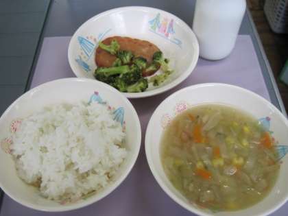 ごはん やさいス−プ ボロニアステ−キ ブロッコリ−のドレッシングあえ 牛乳