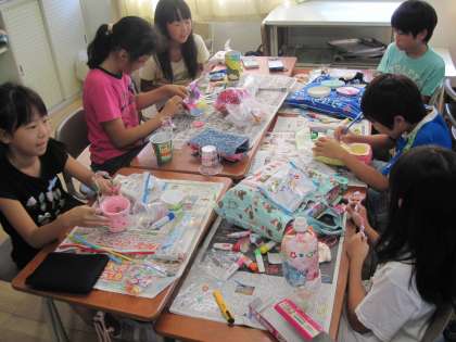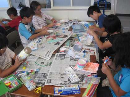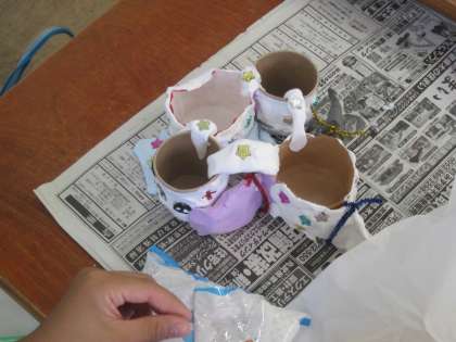 図工で楽しく使えるもの作っています。身の回りの材料を使って、花びんや小物入れなどどんなものがあったら楽しいか考えて作っています。
