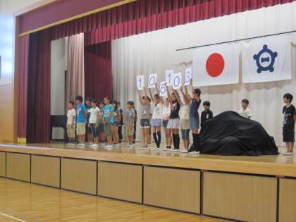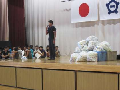 今朝は、児童集会が行われました。代表委員会の児童が、今年度集まったエコキャップが105,103個になったことを紹介しました。そして、それをチームプレッジオブアースの代表の方に渡しました。その後、その代表の方からお話を聞きました。「このエコキャップをお金に換え、それで薬を買って、薬が買えなくて困っている国に送る」ことを話されました。