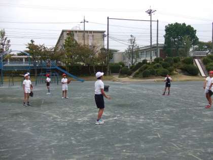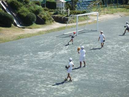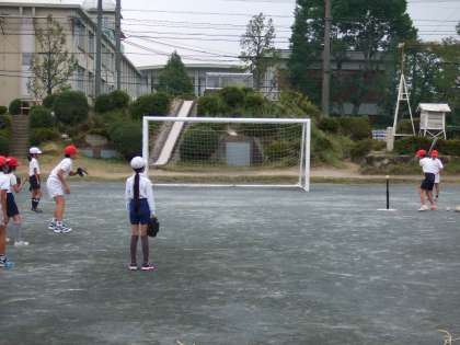 5年生の体育の様子です。今、ソフトボールを行っています。今日は、バッティングの練習です。球を打つ人、守る人に分かれて練習しました。もうすぐ試合形式の練習が始まります。まずはルールを覚えることができるようがんばります。