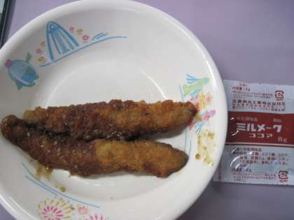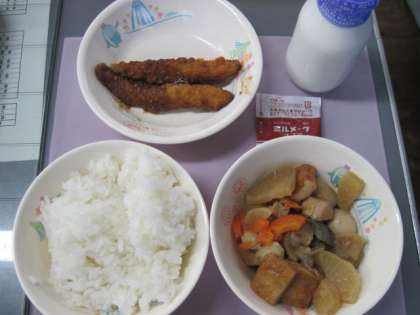 ごはん かんとうに ししゃもフライのごまソ−スかけ ココアパウダ− 牛乳