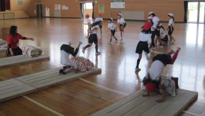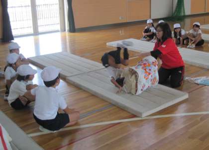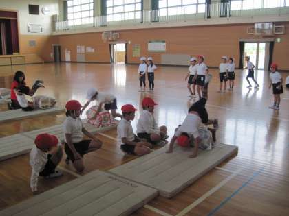 体育でマットを使った運動遊びを行いました。前転がりを十分楽しみました。