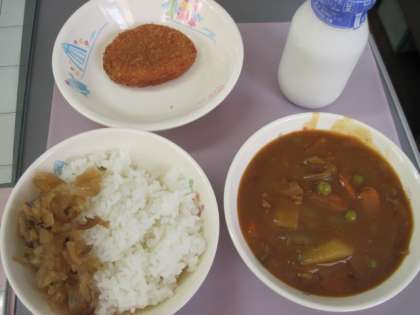 ごはん コンこんカレ−ライス さつまいもコロッケ ふくじんづけ 牛乳