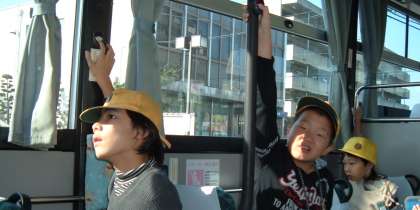 中学校へ行く途中で道路の歩き方、バスの乗り降りの仕方など、ルールやマナーを学びました。