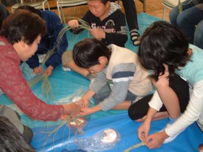 中学校では、わらを編んで作る“しめ縄飾り”を体験しました。