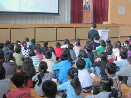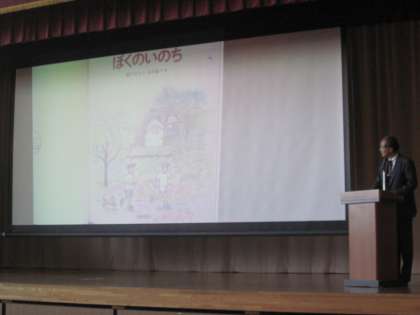 今朝の児童朝礼は、校長先生の読み聞かせでした。「ぼくのいのち」という絵本です。スクリーンに映し出された絵をじっと見つめながら聞きました。