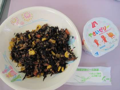 ごはん ぶたじる ひじきのいために やさいゼリ− 牛乳