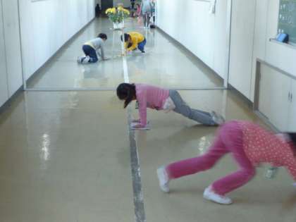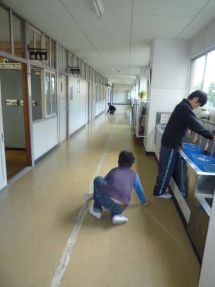 老人会女性部の方々からいただいた雑巾を使って、清掃を行っています。寒くなりましたが、水拭きもがんばっています。家庭や地域の方々の手作り雑巾は、子どもには使い勝手がよく、大活躍です。