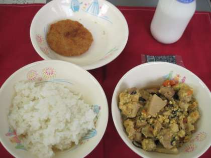 ごはん おやこに ミンチカツ 牛乳