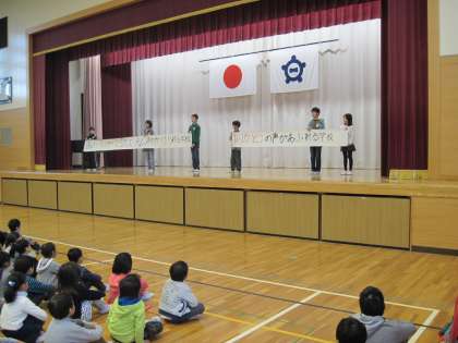 今朝は児童集会が行われました。今日の児童集会は、来週から始まる人権週間について児童会役員から説明がありました。