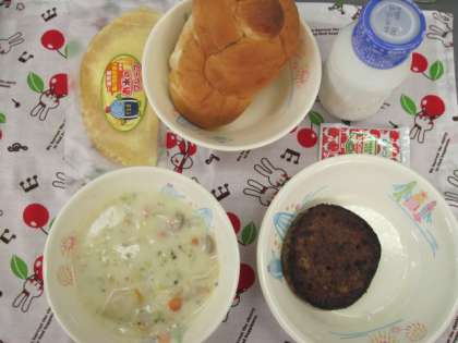 りんごパン いちみんシチュ− ポパイハンバ−グ おこめのクレ−プ 牛乳