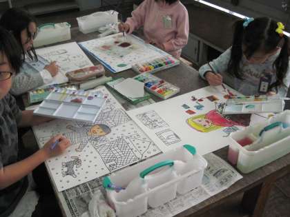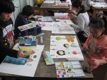 図工で物語の絵を描いています。色の塗り方を工夫して表現しています。