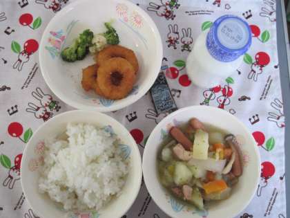 ごはん ボトフ いかリングフライ はなやさいドレッシングあえ 牛乳
