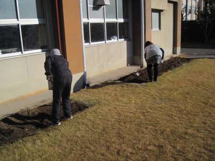 今日は、花ボランティアの方に来ていただきました。花壇を耕し花の苗や球根を植えていただきました。寒い中、ありがとうございました。