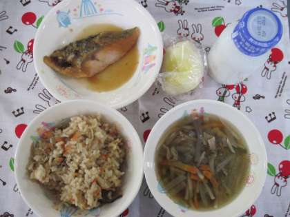 ごもくごはん さわにわん さけのおろしだれ りんご 牛乳