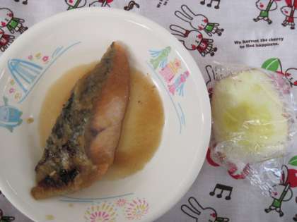 五目ご飯をおいしくいただきました。鮭のおろしだれやりんごもうれしそうに食べていました。