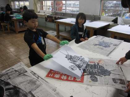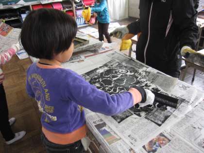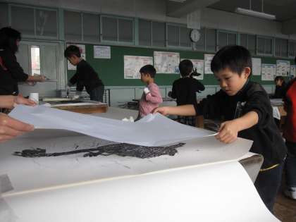 1年生では、図工で取り組んだ紙版画の印刷ができ上がりました。インクをローラーでつけるのは、なかなか難しかったようですが、手を真っ黒にしながら頑張りました。和紙をはがす瞬間は、「うわぁ〜!」と喜びの表情でした。