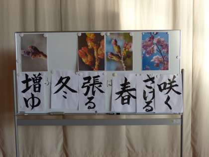 「3学期は、寒い冬と暖かい春を迎える学期です。校庭にある桜の木は、春にきれいな花を咲かせるために、小さな芽を出しじっと待っています。ただ待っているのではなく、きれいな花を咲かせるためにエネルギーを増やす努力をしています。この季節が「増ゆ」(冬)です。エネルギーがどんどん増えてくると、体が張ってきます。その張ってくる季節が「張る」(春)です。張って張って体が耐え切れなくなると裂けてしまいます。その裂ける状態が「咲く」です。