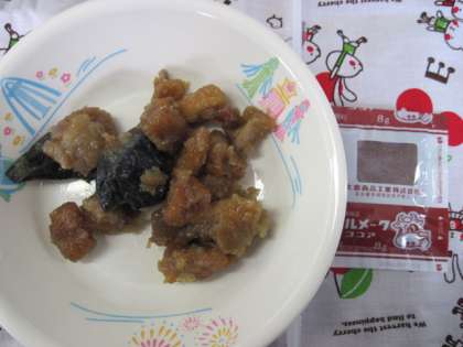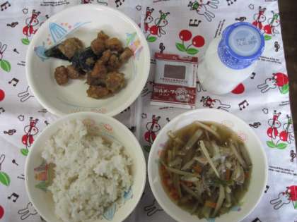 鶏唐揚げのおろし煮は、応募献立の入賞献立でした。新メニュ−をおいしくいただきました。牛乳もココアパウダ−がついて、おいしく飲めました。