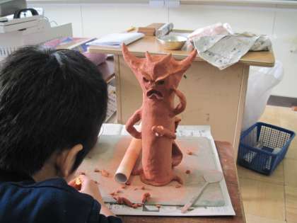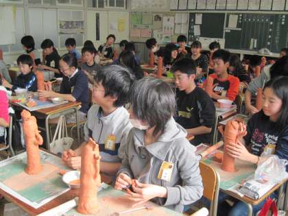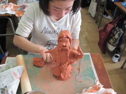 6年生の展覧会の立体作品は「偶像」です。文様のつけ方や動きを工夫して作っています。