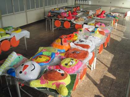 展覧会の立体作品のお面が出来上がってきました。出来上がった作品は家庭科室で保管しています。一人一人の思いを形と色で表現しました。