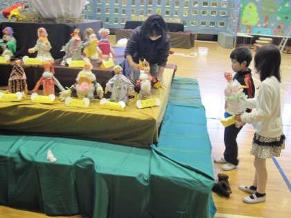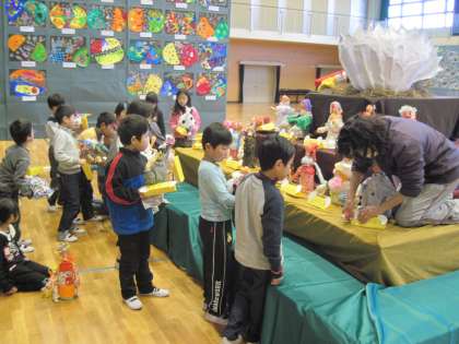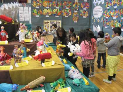 今日は、クラスごとに立体作品を並べていきました。ふしぎなたまごからどんなものが生まれたか、楽しみにしていてください。