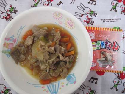 プルコギ風の牛丼をおいしくいただきました。ア−モンドの入った小魚もおやつ感覚でおいしくいただきました。