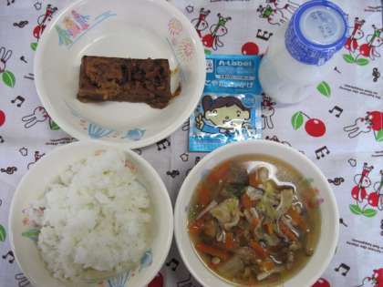 ごはん ちゃんこじる あつあげのにくみそかけ わかめふりかけ 牛乳