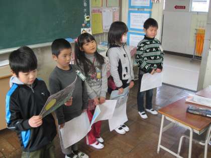国語の時間に、紙芝居の練習を行いました。グループで発表します。それにむけての練習です。大きな声で発表できるよう協力して練習しました。発表会が楽しみです。