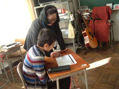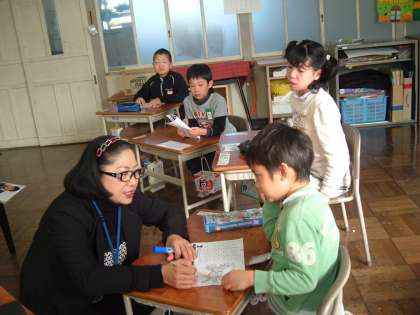 スーサン先生と英語の学習をしました。「ABCのうた」や「BINGO」の歌を歌いました。アルファベットを線でつなぐプリントの後に一人ひとり発音を聞いていただきました。ABCと順に読めるようになりました。