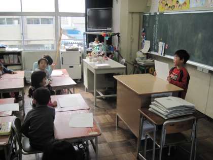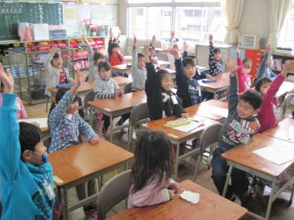 国語の時間に「これはなんでしょう?」を行いました。これは何かを尋ねる子に質問をします。そこからそれが何かを当てます。みんなじょうずに質問をできました。