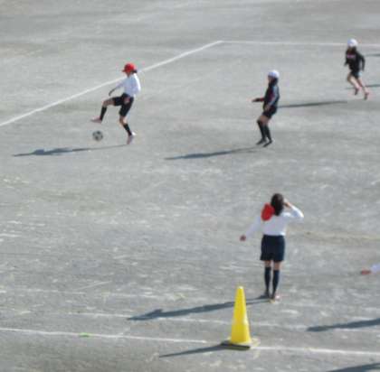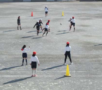 体育でサッカーを行いました。パス練習をした後、ゲームを楽しみました。