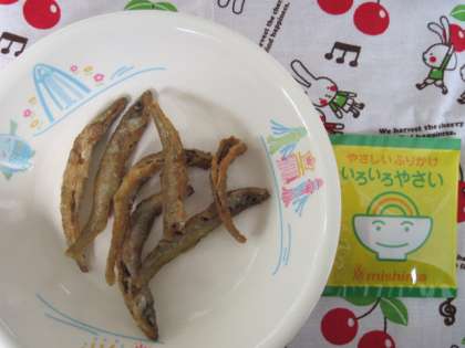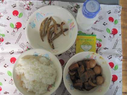ごはん みそおでん わかさぎのからあげ やさいふりかけ 牛乳