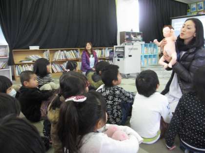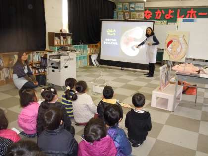 「いのち」の始まりから、妊娠中の赤ちゃんの様子、出産時の赤ちゃんや家族の様子を紙芝居や映像などを使って、お話してくださいました。お母さんのおなかの中に10カ月いること、へその緒でお母さんと繋がり、栄養をもらっていること、小さな時から心臓が動いていることなど…子どもたちにとっては、初めて聞くことばかりでした。授業後の子どもたちの感想に「お父さん、お母さんから分けてもらった命を大切にしたいと思います。」という言葉がありました。今日は貴重な授業を通して、命の大切さを考える良い機会となりました。