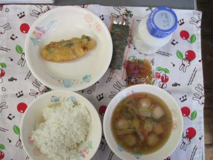 ごはん とりにくだんご さわらのてんぷら あじつけのり 牛乳