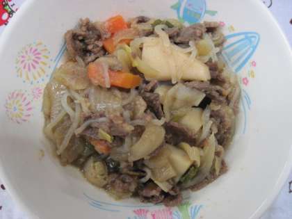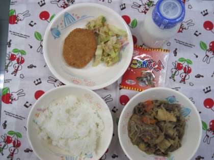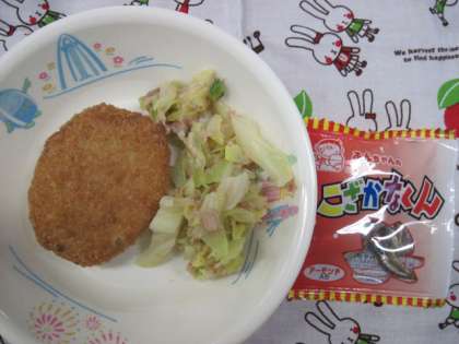 牛丼をうれしそうに食べていました。おからのコロッケやキャベツのツナあえもおいしくいただきました。ア−モンドこざかなは、おやつのようでおいしかったです。