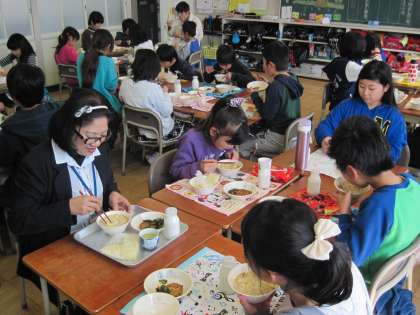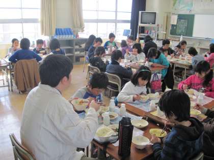 今日の給食は、外国語指導助手の先生と一緒に食べました。先生は、今日が最後の日でしたので、感謝の気持ちを込めて会食しました。一年間、楽しい授業ありがとうございました。
