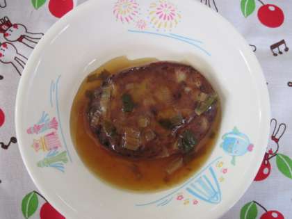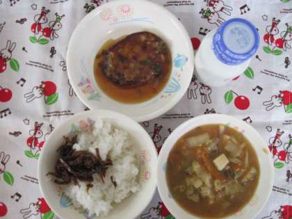 ハンバ−グのねぎあんかけとこうなごのつくだにをおいしくいただきました。めかぶのみそしるもとてもおいしかったです。