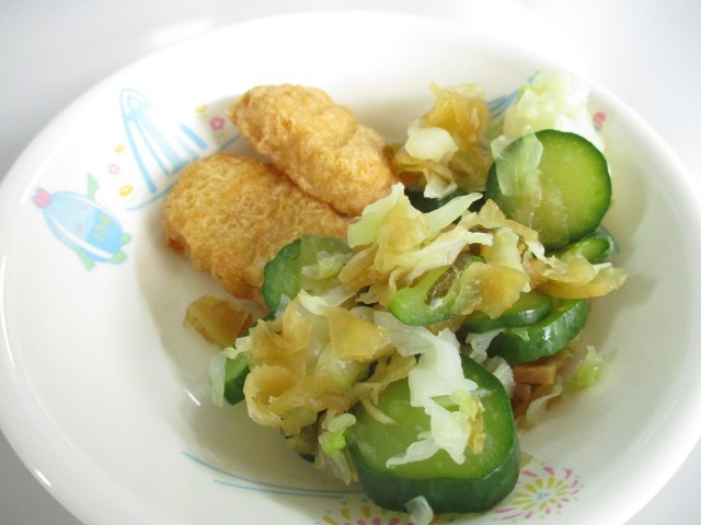 福神漬はだいこん、なす、うり、きゅうり、しょうが、なたまめ、れんこん、たけのこなどのうちから5種類以上を細かくきざみ、調味料に漬けたものです。今日の福神漬和えは福神漬をキャベツやきゅうりと和えたものです。カレーとともに味わって食べてください。