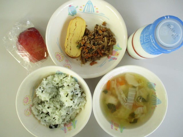 今日の給食は、わかめご飯、牛乳、厚焼き卵、ごぼうの甘辛いため、えびしんじょうの吸い物、りんごです。