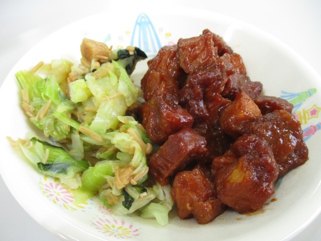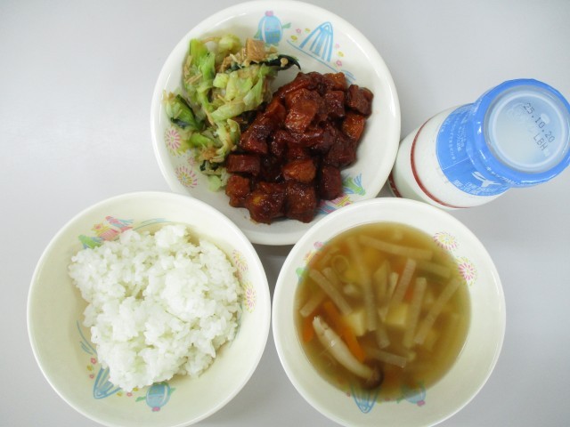 今日の給食は、ごはん、牛乳、かつおのあけぼの和え、キャベツのなめたけ和え、秋の香り汁です。